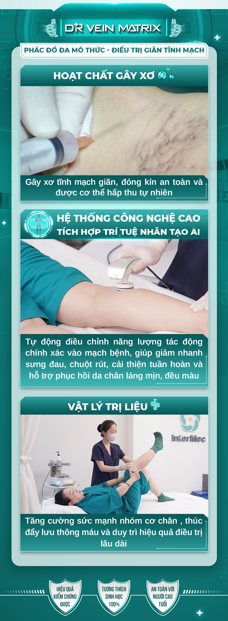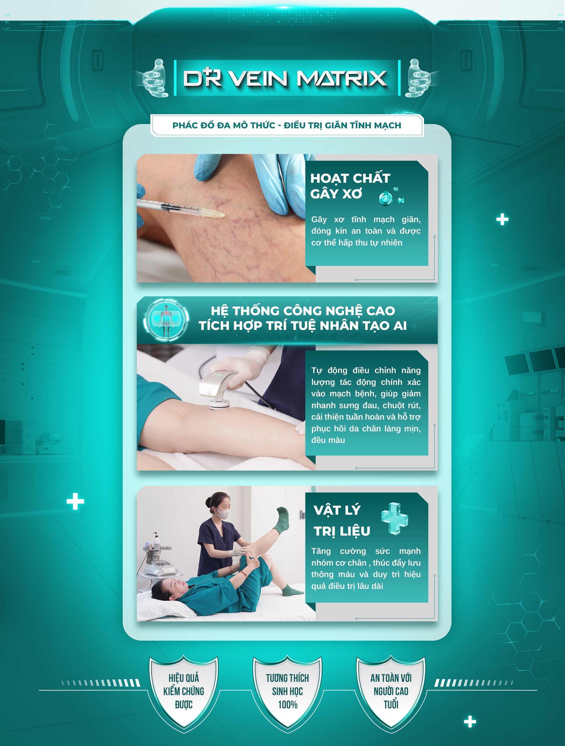 Với phác đồ điều trị đa mô thức Dr Vein Matrix an toàn, hiệu quả cao. Hội tụ hệ thống máy công nghệ cao tích hợp trí tuệ nhân tạo AI, cùng Bác sĩ mạch máu cao cấp tu nghiệp nước ngoài trực tiếp thăm khám và điều trị.
